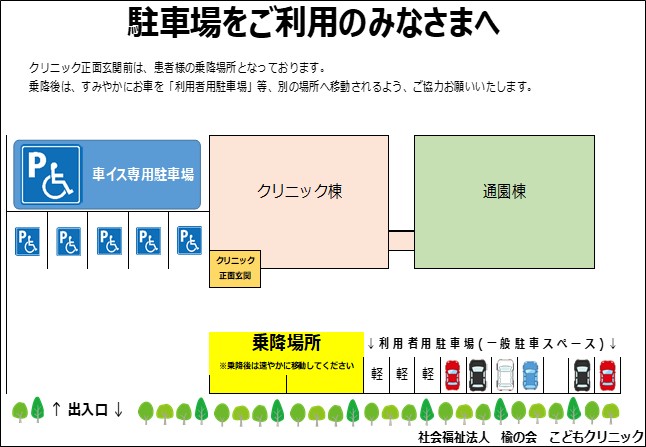 さて、標記の件につきまして、スムーズな乗降と駐車場のご利用に関して改めてお願いしたく、ご案内申し上げます。当院の駐車場は、クリニック玄関前の「車両乗降スペース」、玄関横の「車いす専用駐車場」、クリニック棟前の「利用者用駐車場」がございます。そのうち、「車いす専用駐車場」につきましては、運転される方が「診療の付き添い者」である方を優先して停めていただくこととしております。当院をご利用のみなさまにおかれましては、クリニック棟前の「利用者用駐車場」にご利用くださいますようお願い申し上げます。