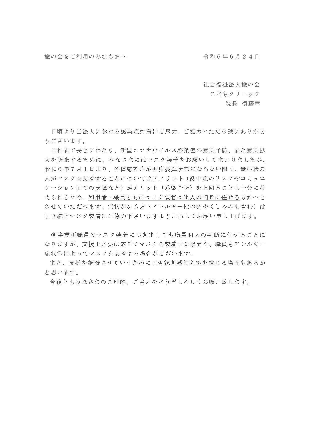 楡の会におけるマスク着用義務化解除につきましてお知らせいたします。